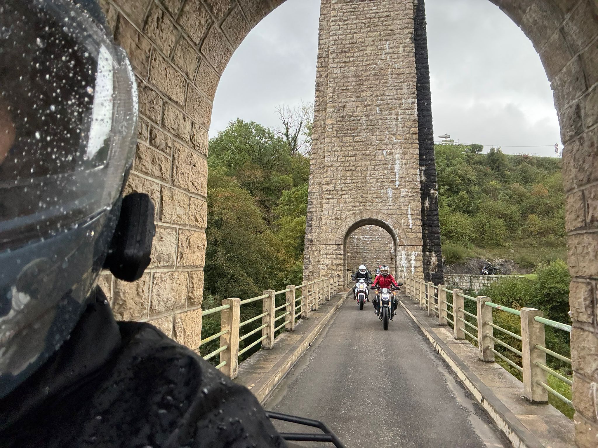 Au départ de Valleiry, les habits de pluie enfilés nous nous dirigeons dans le brouillard vers le pont de Pyrimont avant le plateau du Retord .